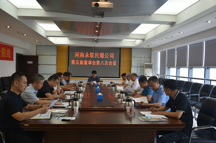 河南省永聯(lián)民爆器材股份有限公司第五屆董事會(huì)第八次會(huì)議于2020年7月31日在鄭州市惠濟(jì)區(qū)開元路79號(hào)(7樓會(huì)議室)召開。會(huì)議應(yīng)到董事11人,實(shí)到董事10人(1人請(qǐng)假并委托投票),應(yīng)到監(jiān)事5人,實(shí)到監(jiān)事4人,符合《公司法》及公司《章程》的有關(guān)規(guī)定,會(huì)議有效。會(huì)議由董事長(zhǎng)劉嵩同志主持,董事會(huì)秘書王虎同志記錄。