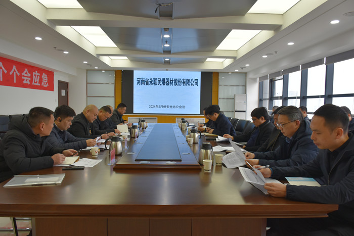 2024年2月29日,河南省永聯(lián)民爆器材股份有限公司召開了2月份安全辦公會議,公司領(lǐng)導(dǎo)班子、安委會成員、安委會辦公室成員以及駐馬店市、嵩縣、舞鋼市、焦作市、衛(wèi)輝市、鄧州市等6家分公司負(fù)責(zé)人參加了會議。會議由公司副總經(jīng)理靳義國主持,公司董事長、總經(jīng)理劉嵩參加會議并講話。